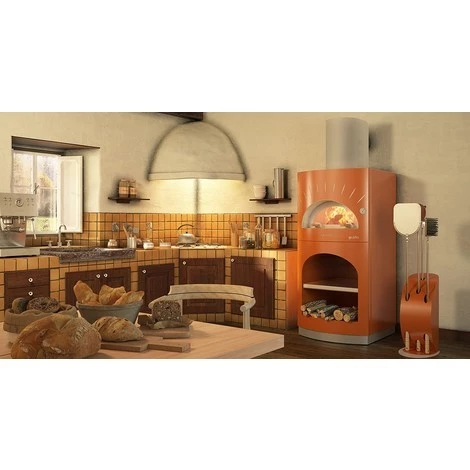 GUSTO est un four à bois pour l’intérieur qui permet de préparer 2 pizzas à la fois ou 2 kg de pain après un préchauffage court de 15 mn. Sa porte en verre éclaire la pièce avec la lumière de la flamme.