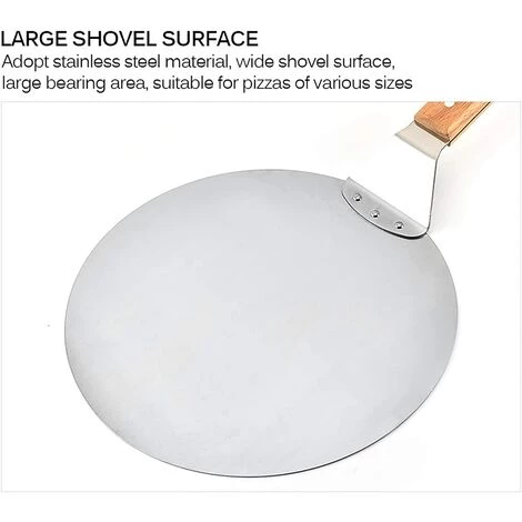 Grande surface de la pelle : la surface de la pelle est en acier inoxydable avec une grande surface de pelle et une grande surface d’appui qui convient pour les pizzas de différentes tailles.