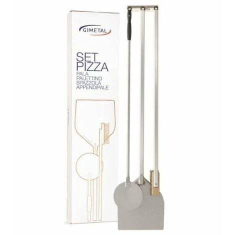 Set de 4 pcs pour pizza maison en acier aluminisé, Made in Italy, Qualité Professionnelle.COMPOSITION : – Pelle à cuire 32 x 30 cm, longueur 120 cm.- Palette pour tourner et cuire, diamètre 20 cm, longueur 120 cm.- Brosse avec poils en laiton réglables, longueur 120 cm – Support de pelle à 3 emplacements du mur, idéal pour ranger les outils.