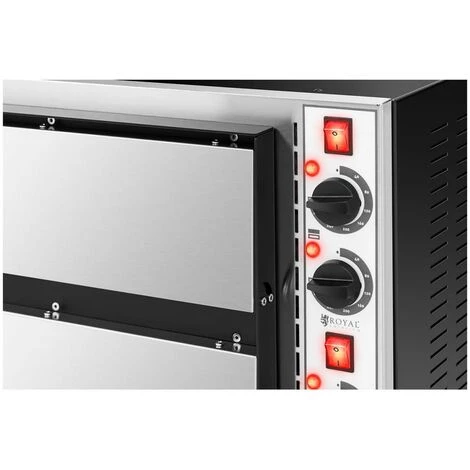 La température joue un rôle essentiel lors de la préparation de la pizza. Voilà pourquoi ce four est doté de chambres de cuisson avec voute et sole indépendantes dont la température peut être réglée sur 50 à 320 °C au moyen de molettes. De cette manière, il est possible d’obtenir une pâte mince et croustillante, recouverte d’une garniture juteuse sur laquelle fond la mozzarella. Chaque cavité accueille une pizza (ou tarte flambée) de 32 cm de diamètre, ce qui vous permet de faire cuire 2 pizzas en une seule fournée. Grâce aux 4 éléments chauffants de 800 W de la voute et de la sole, la montée en température est très rapide. Faites la joie de la clientèle en servant de délicieuses pizzas tout droit sorties du four, grâce aux appareils de cuisson Royal Catering !