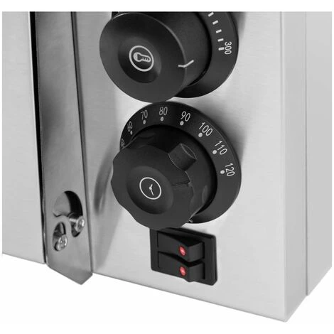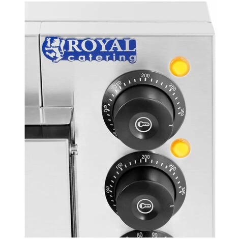 Le four à pizza de Royal Catering est une aide précieuse pour préparer toutes sortes de pizzas. Cet appareil de cuisson pratique est parfaitement adapté aux pizzérias italiennes, mais convient également aux cafés, bistros et snackbars. Un contrôle précis de la température avec réglage séparé pour les résistances chauffantes supérieure, intermédiaire et inférieure, une pierre à pizza professionnelle en argile réfractaire et une minuterie fiable : ce four à pizza dispose de tous les outils nécessaires pour obtenir une pizza parfaite. Le four dispose d’une puissance de 3 000 W qui lui permet d’atteindre rapidement la température voulue sur une plage de 50 à 350 °C. Laissez-vous convaincre par une qualité élevée et un service compétent : optez dès aujourd’hui pour un four à pizza Royal Catering !